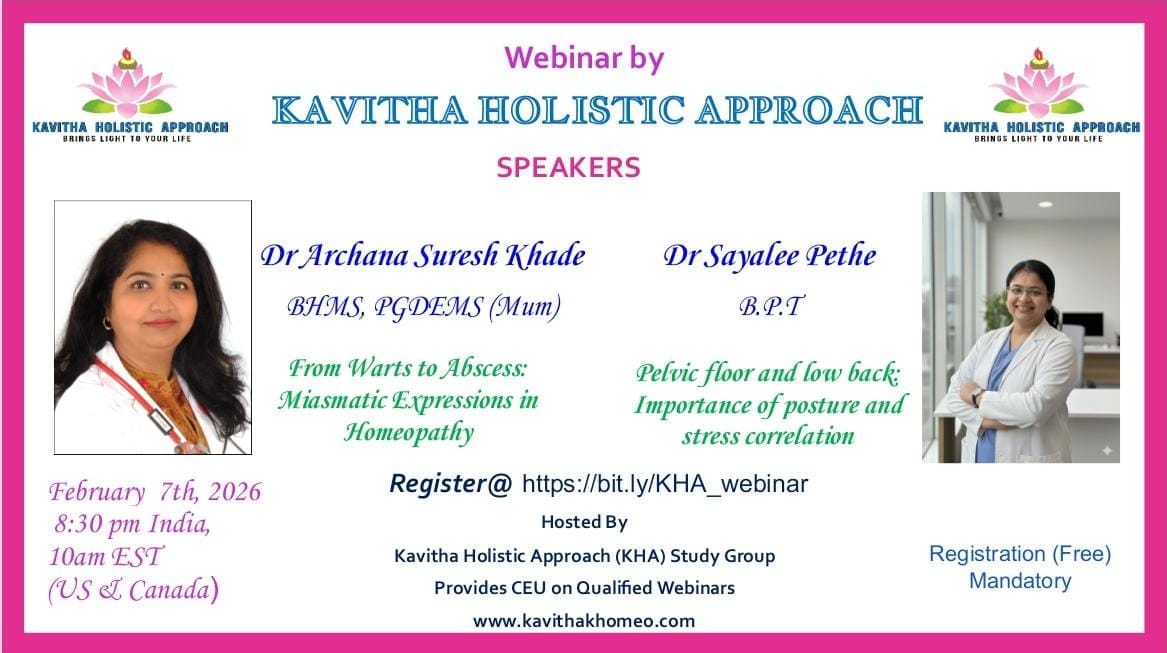 KHA HOMEOPATHY STUDY GROUP Hosted byKAVITHA HOLISTIC APPROACH WELCOMES YOU Date- MARCH 21ST 2026 Time: 8.00PM IST / 10.30 AM EST(US/CAN) Speakers of the month 1. DR SAMIR CHAUKAR BHMS,MD (Hom),FCAH,DND,HMD(UK),PG Hom(London) TOPIC -Roll Of Homoeopathy In Autism Spectrum Disorders 2. DR NIHARIKA SAPRA CFN,CNCC,BHMSTOPIC - Understanding Sleep -Mental Health Continuum Registration mandatory. Click below link to Registerhttps://bit.ly/4aSboZqYOU CAN ALSO REGISTER ON OUR WEBSITE LINK https://kavithakhomeo.com/kha-homeopathy-study-group-webinar-role-of-homoeopathy-in-autism-spectrum-disorders-by-dr-samir-chaukkar-and-understanding-the-sleep-mental-health-continuum-by-dr-niharika-sapra/Contact for any query👇[email protected] Visit: www.kavithakhomeo.com